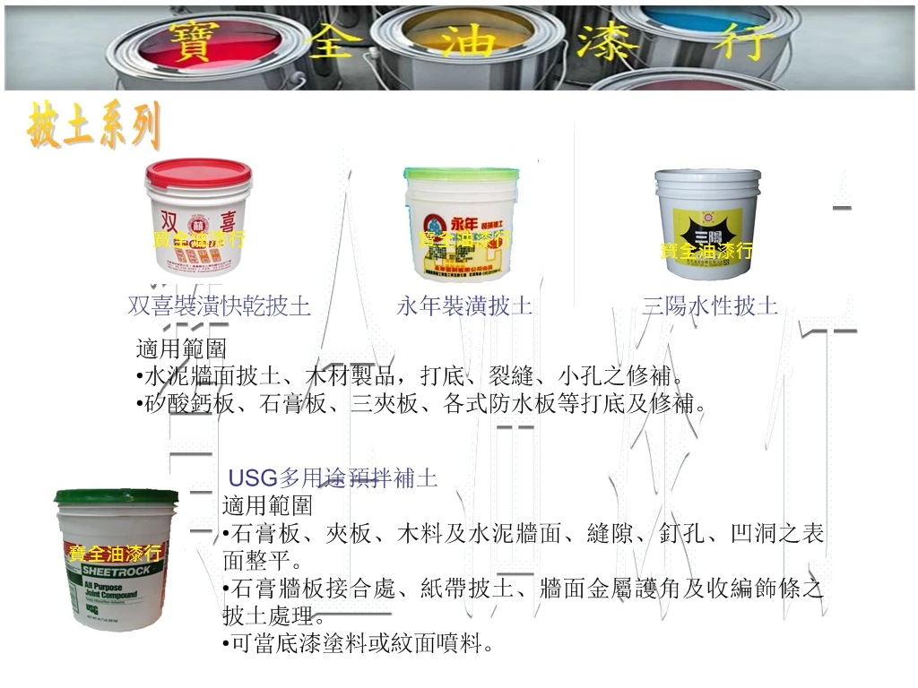 披土系列 双喜披土 三陽披土 永年披土 USG SHEETROCK 美國多用途預拌補土 歡迎至本店洽詢購買!