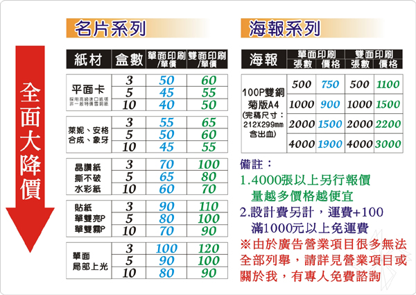開幕廣告設計、彩色名片、DM、海報、傳單囍帖、請柬、紙袋、信封、型錄製作、彩色貼紙、廣告面紙、廣告筆、車體廣告噴畫、布旗、布條複寫紙、三聯單、Mo年曆卡、貴賓卡、大型海報噴畫、戶外帆布噴畫、室內外彩色噴畫、燈箱片訂製、大圖配件掛軸*捲軸*L形*弓形展示架*招牌工程製作、施工 .自備吊車