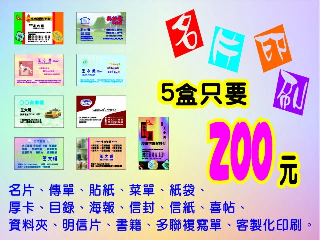 名片、傳單、貼紙、菜單、復寫三聯單、紙袋、厚卡、目錄、海報、信封、信紙、資料夾、明信片、書籍、數位商品、客製化印刷。