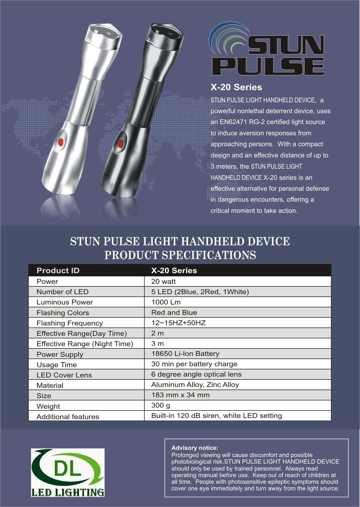 >產品獨特性:制暴保安脈衝光LED手電筒是採用特殊波長的強光LED及獨特閃動頻率研製合成;此一獨特的脈衝光線,會讓人的視覺神經與腦波產生干擾,造成人產生短暫暈眩與失去行為能力。