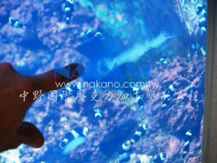 壓克力材質的另外一個特性在於表面雖然受傷,但仍可透過研磨拋光而回復到先前的光亮如新,圖例為水產試驗所東部海洋生物研究中心的小丑魚展示缸,原本在壓克力視窗上相當明顯的傷痕,透過研磨拋光後即回復晶瑩剔透的原貌,更多相片可參閱本公司網頁,因考量展示缸的安全性,本公司另外加上熱處理,以提高壓克力視窗的強度。