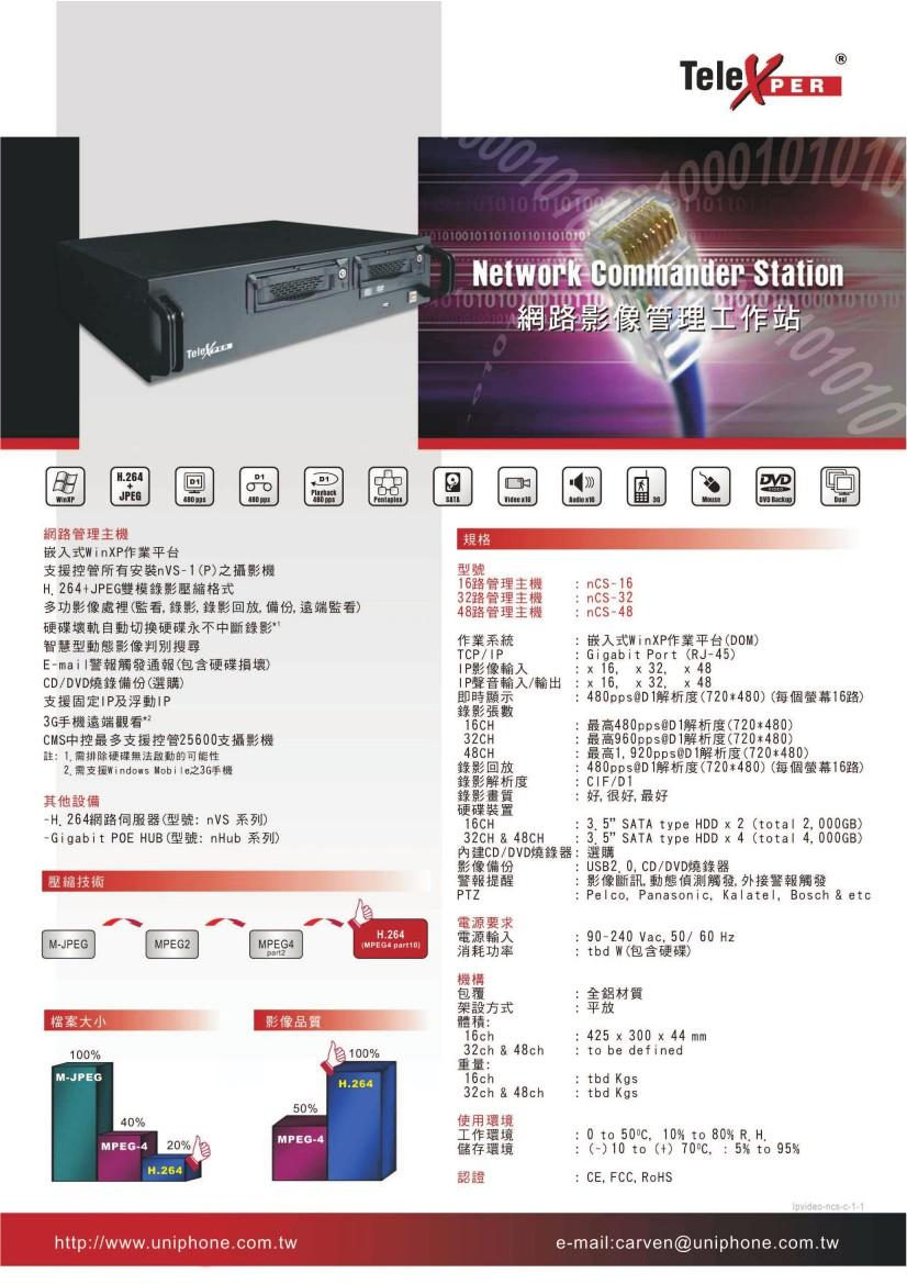台恩通信有限公司 服務電話:03-4639688 數位安防監控方案產品提供您優於其他產品之最快速的安裝與最簡單的設定方式, 而所有設備需安裝在有 IP 分享裝置的安全網路環境下, 建議您使用當地市場上最普遍的路由器(Router)或 IP 分享器(IP Gateway). 如 D-Link, 3COM, Cisco 等網路產品製造商所提供的產品影像伺服器所使用的 POE(Power over Ethernet)技術, 利用網路線透過 RS-45 連接埠由 POE 集線器供應電源, 亦可再由影像伺服器提供攝影機電源. 此一技術大幅減少了監控用線路建置的人力與成本, 僅以 Cat-6 網路線取代傳統攝影機所需之同軸電纜與控制線路, 也減低了監控施工的難度. 特長 - 可將早期傳統的類比監視系統升級到數位的監控管理系統 - 支援 H.264 和 JPEG 的新雙核解碼設計技術 - 運用新一代 POE 技術, 不需額外的再安裝電源線給攝影機, 迅速又便利 - 安裝費用比傳統的類比監視系統省了約 50% - 顯示和錄影模式, 最高可達 D1 解析度, 每秒 30 張- 支援 ISP 業者提供的浮動 IP桃園電話總機-監控系統-台恩通信有限公司