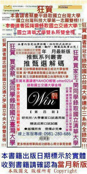 (包含完整提供詳細範例、成功者揭密、最近期情報) 書面審查資料/口試/面試必備學長姐之成功錄取範例與書審資料準備要訣、機密以及各項口試面試秘訣(包含考古題、答題技巧、面試技巧、場景圖) 注意事項......等 您想瞭解書面審查委員及口試委員的錄取準則為何?您需要已經錄取多所國立學校的學長姐書面審查範例與口試成功錄取經驗分享嗎?您知道推甄無論是書面審查或口試面試都有很多機密必須知曉的嗎?您想一次就錄取嗎? 那麼您絕對不會想錯過【推甄選解碼】最新版第5刷 本書為《通用版本》,適用各類需要書審(備審)資料/口試/面試之升學考試,如:推甄研究所、研究所在職專班、一般研究所或大學筆試後之第二階段面試/口試/書面審查、大學推甄、大學甄選入學、博士班推甄、二技、二技在職專班、四技二專、技優保甄、大學甄選入學、大學個人申請入學、大學繁星計畫、大學辦理指定項目甄試、轉學考、各類申請入學、EMBA、碩專班、產碩班其他各類書面/口試整理準備......本書錄取讀者皆來自各不同校系(詳推甄選解碼讀者成功錄取榜單),本書任何科系皆可參考適用! 是誰說私校進不了公立學校? 有《推甄選解碼 - 第五刷》,私校一樣挺進公立學校!鐵證如山! 【推甄選解碼-國立台灣大學蔡*平讀者錄取心得】 累積了筆者豐富的經驗,看完這本書之後,經由書中的一些介紹及小秘訣讓我能夠花最少時間去準備相關資料,對於不知道要如何準備資料審查及口試的學子來說,實在是獲益良多,實在是很感謝本書的作者,這本【推甄選解碼】參考用書實在讓我獲益匪淺 【推甄選解碼-國立台灣大學林*宏讀者錄取高中三系所三金榜】 【推甄選解碼-國立台灣大學蔡*媛讀者高中金榜】 【推甄選解碼-國立台灣大學私校首次報考即錄取讀者錄取心得】 還好有發現推甄選解碼這本書,原來其實是蠻慌亂的,也差點衝動去報補習班(超貴!),還好沒有報(汗),我開始做備審資料已經較遲了,是因為還在猶豫要不要報考......推甄選解碼裡面分類很清楚詳細,個人是覺得比市售的簡單明瞭,內容也比較實在,裡面也提供了一些面試考古,幫助蠻大的,很值得做為參考。 【推甄選解碼-國立交通大學&國立清華大學張*珮讀者雙金榜錄取心得】 推甄選解碼讓我對申請學校需做的備審資料有詳全的認識,書中許多技巧和常見問題的解答,讓我大幅提升製作的效率與效果,不會再毫無章法的書寫自傳,而是迅速掌握要點,把自己用力地推銷出去!真的很高興能錄取,申請入學最重要就是備審資料了,而我的備審資料分數超高,這也就是我錄取的原因,推甄選解碼大大的提升了我的分數,真的是太好用了!! 【推甄選解碼-國立清華大學&國立中興大學施*酉讀者雙金榜錄取心得】 其實我相對優勢並不高,尤其對於書審資料的內容編排和格式,但經過拍賣網站的搜尋後,買了這本書,書審資料的撰寫對我實質的幫助很大,讓我節省了不少時間擬稿,讓我能有更多時間去修改���另外,在口試的參考資料上,推甄選解碼有著非常多的考古題,更讓我準備上能駕輕就熟,也省去很多搜尋資料的時間,還有很多面試的技巧與禁忌,讓我不再懼怕,我十分推薦! 【推甄選解碼-國立清華大學王*閔讀者錄取心得】 在這段時間,要同時蒐集許多如何撰寫自傳、讀書計畫、研究計畫的資料,到時撰寫備審資料時才有方向,不過媽媽幫我找到一本有別於其他的參考書目,那就是-【推甄選解碼】。我去口試的經驗來說,也應證了書中的口試要訣。 【推甄選解碼-國立交通大學鍾*明讀者錄取高中金榜】 【推甄選解碼-國立交通大學洪*涵讀者錄取高中金榜】 在購買【推甄選解碼】後,馬上就翻閱起來,一開始就可以知道一些學校的面試情形,也可以馬上知道自己該準備甚麼,了解各個備審資料該如何準備!很幸運讓我能找到【推甄選解碼】這本書!