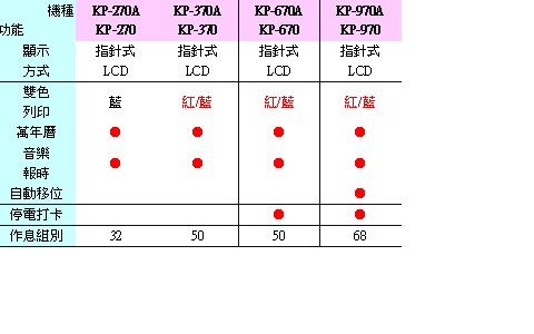 特性: 1. 全新設計,時髦外型,配合辦公室擺設。 大型鐘面顯示,清晰易讀。 2. 精準耐用,月底,閏年皆自動修正。 3. 使用方便,上下班打卡可自動移位,並可