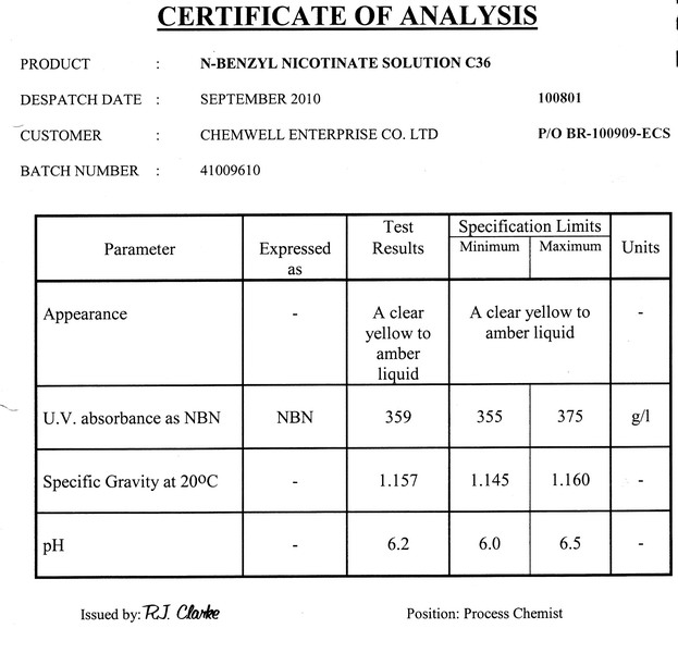 N-BENZYL NICOTINATE PRODUCT SPECIFICATION Appearance: clear yellow to amber liquid