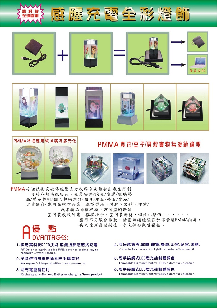 全世界第一個觸摸型無線感應充電式水晶燈,採用高科技RFID技術,即無接點感應式充電。其產品優點如下。