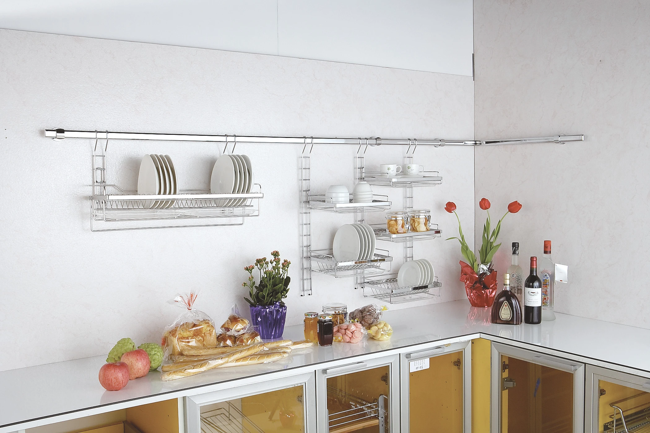 本產品為本公司開發生產製造,材質為不鏽鋼,其優勢在於它是可以依個人的喜好做調整懸掛,讓你的廚房能有自己的專屬風格,在傳統的廚房用品增添優雅的質感。 圖片中,本公司是採用F29076-精簡單層可調式盤