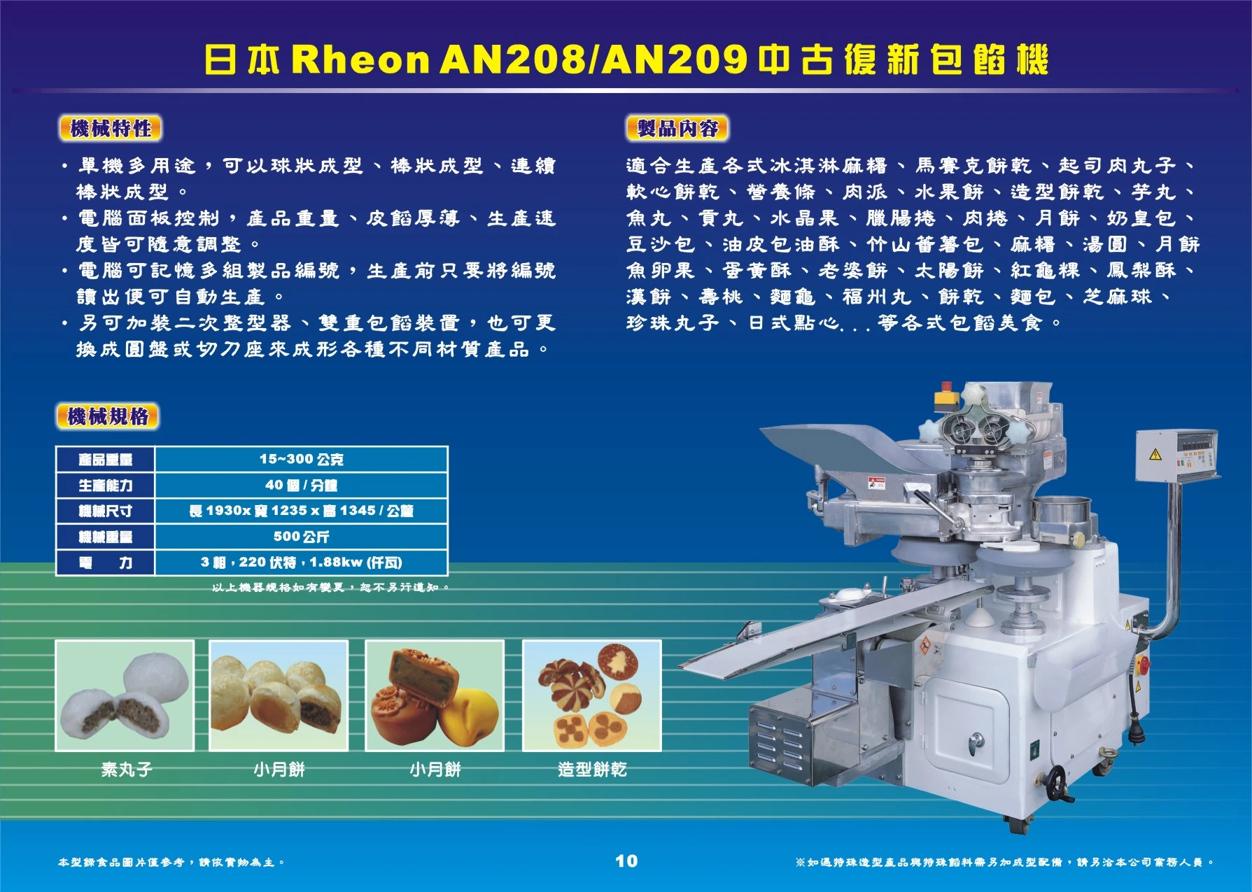 適合生產各式冰淇淋麻糬、馬賽克餅乾、起司肉丸子、軟心餅乾、營養條、肉派、水果餅、造型餅乾、芋丸、魚丸、貢丸、水晶果、臘腸捲、肉捲、月餅、奶皇包、豆沙包、油皮包油酥、竹山蕃薯包、麻糬、湯圓、魚卵果、蛋黃酥、