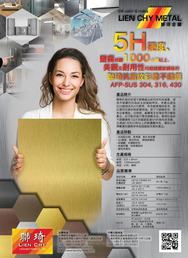抗指紋不銹鋼使用于國際知名家電品牌、冰箱面板及廚房用具用品。抗指紋塗膜顏色可依客制化生產,聯琦抗指紋不銹鋼的鹽霧測試可達1500小時以上,具高硬度及良好加工性。同時也使用于國際知名電梯大廠,具有易擦拭、耐刮的優點,可解決不銹鋼表面髒汙保養問題。抗指紋不銹鋼是運用科技技術在不銹鋼板上塗覆彩膜,使不銹鋼表面具有抗指紋、易擦拭及增加抗腐蝕能力等效果;底材厚度0.2~1.6mm,顏色可依客制化要求,提供各種選擇。產品廣泛運用於建材及家電領域,且皆通過SGS ROHS,以符合環保需求。