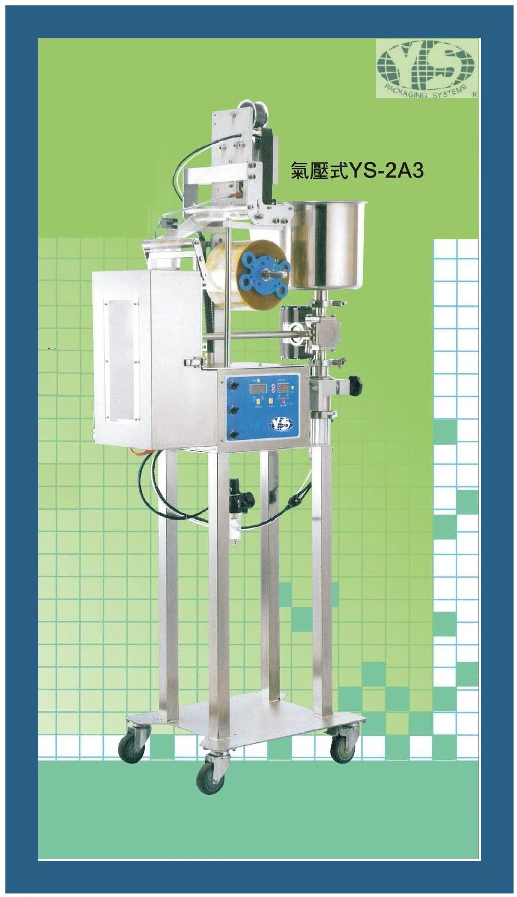 特性: 1. 精緻小型化設計(直立式/桌上型)。 2. 封切定位採用電眼、時間及長度計時器控制,製袋精準。 3. 採用溫度控制器、加熱平穩,性能佳。 4. 液體流經組件採用不銹鋼或Teflon不銹鋼外殼,符合務生標準要求。 5. 擁有選擇性設備,可選用日期打印機、攪伴器、雙層料桶。 ☆ a. 適用廠所:店面、餐廳、適用品、推銷等…. b.適用各種無顆粒液體包裝,例如:飲料、醬料、牛奶蜂蜜、果糖、醋、洗髮精、化妝水等…