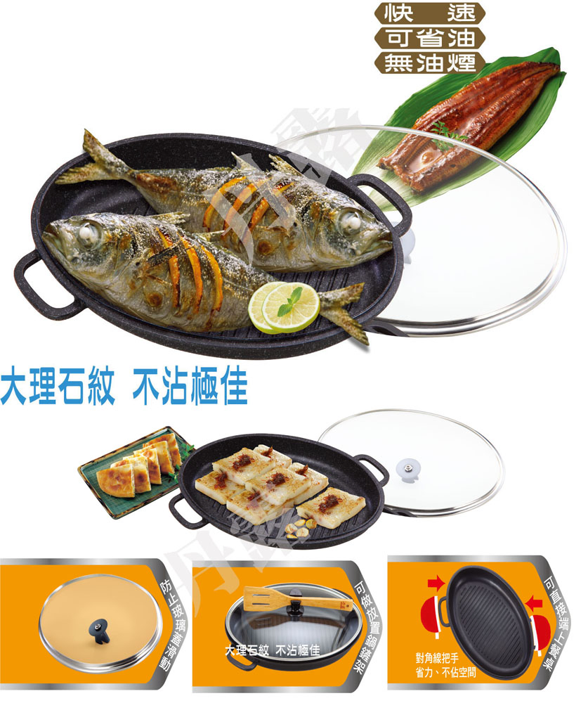 2.波浪大理石溝紋 : 波浪溝紋設計讓烹調之食物不卡油及輕鬆導出肉類油脂,大理石紋不 沾處理,不沾效果極佳.