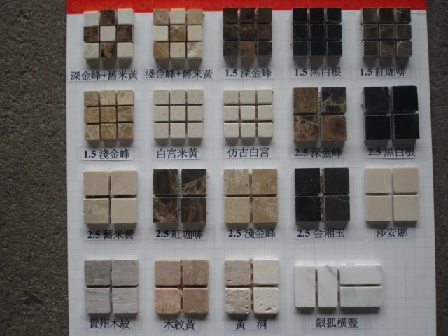 石材馬賽克的拼貼方式及石種不勝枚舉,本公司所經銷石材馬賽克之材質有-九龍璧.黃土玉.深金峰.淺金峰.繡板.黑白跟.舊米黃.貴州木紋.紅咖啡.安山石.芙蓉紅.洞石.雪花白.黃木紋蘑菇面.綠滿天星蘑菇面.