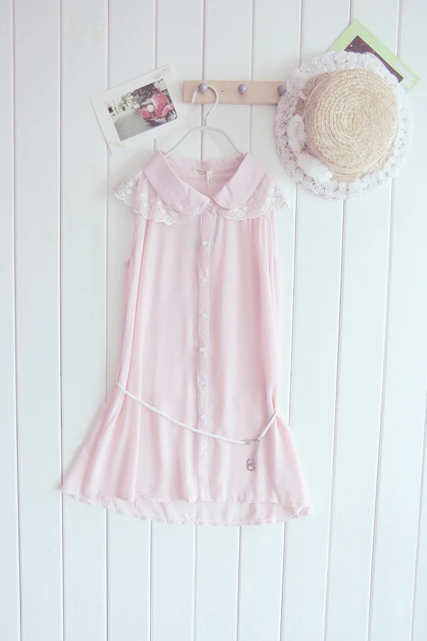 韓版蕾絲勾花边長款襯衫(配腰带)(粉)