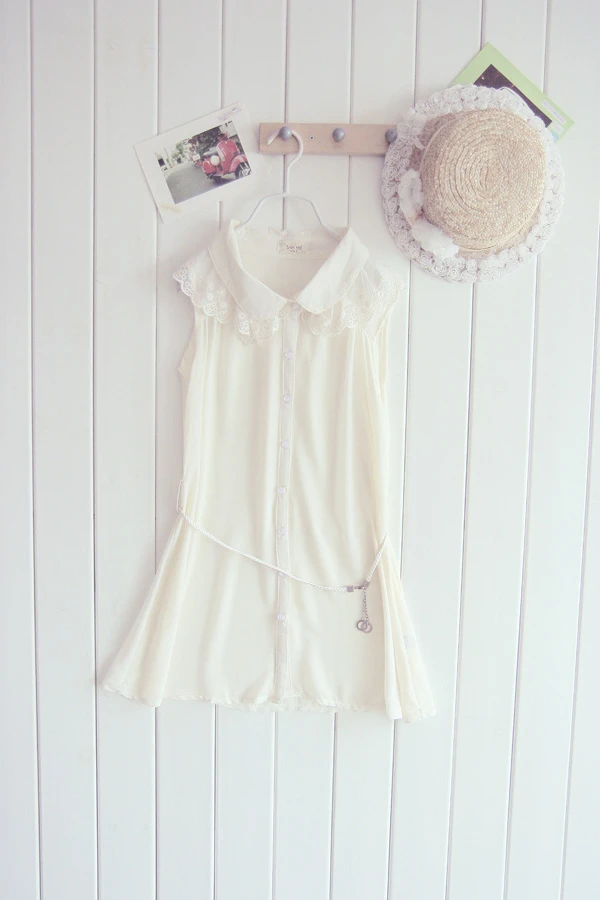 韓版蕾絲勾花邊長款襯衫(配腰带)(杏)