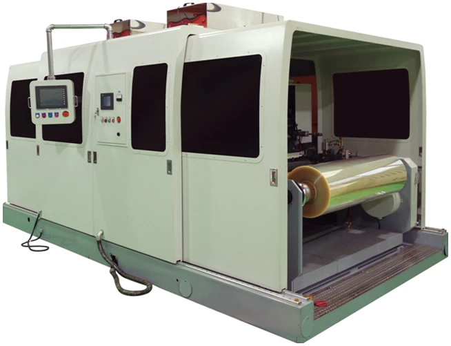 光學級薄膜塗佈UV膠,經成型後,製成複合型聚光片或擴散片等光學膜片。 *可同時塗佈於原材的兩面,節約能源,減少成本支出。 *全伺服系統,精準度高,防溢膠自動偵測電眼、自動張力控制、自動對邊。