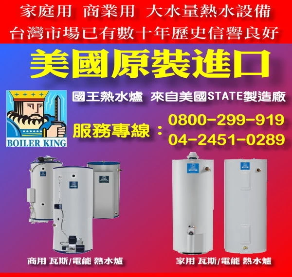 美國原裝進口國王電能/瓦斯熱水爐專業熱水爐設備供應熱水設備美國原裝進口king國王 電能/瓦斯熱水爐0800-299-919 美國原裝進口STATE商業用/家庭用 電能/瓦斯熱水爐.來自美國STATE製造廠.該廠歷史悠久在台灣市場已有數十年歷史.信譽良好.從家庭用商業用大水量熱水設備 規劃 設計 經銷 安裝 維修 服務 365天全年無休 歡迎洽詢 0800-299-919 state water 國王熱水爐熱水器維修 0800-299-919 |