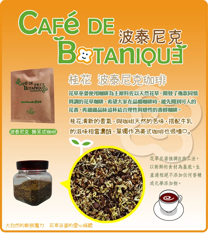 【Café De Botanique】波泰尼克,採Botanique的法文讀音,是花草的意思;花草巫婆意外地發現花草與珈琲結合後的口感,格外的香醇。 【波泰尼克咖啡】花草巫婆在5/30推出最新款的花草咖啡飲品花草巫婆此次大膽的使用咖啡為主原料佐以天然花草,開發了幾款相當同情異調的花草咖啡,希望大家在品嚐咖啡時,能先聞到可人的花香,再細細品味這杯結合理性與感性的香醇咖啡,以達到心情放鬆、壓力紓解,疲勞消除的目的。