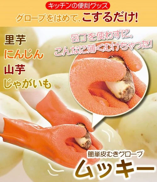 手套表面經過特殊加工處理,可以快速去除薑、馬鈴薯、胡蘿蔔、芋頭、牛蒡、番薯的皮,還可以去除魚鱗清理,非常方便。