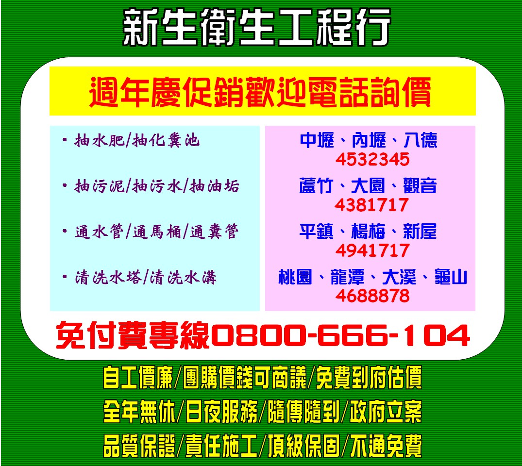 新生衛生0800-666-104【折扣促銷+頂級保固】龜山抽水肥龜山通水管龜山通馬桶龜山抽化糞池龜山洗水塔龜山清水溝龜山馬桶不通龜山水管不通龜山清化糞池龜山通小便斗龜山馬桶包通龜山水管包通龜山包通馬桶龜山包通水管龜山包通小便斗龜山馬桶堵塞龜山水管堵塞龜山馬桶阻塞龜山水管阻塞龜山水管塞住龜山馬桶塞住龜山水管堵住龜山馬桶堵住龜山清理化糞池龜山通糞管龜山抽污泥龜山抽污水龜山抽廢水龜山修理水箱龜山排水管不通龜山通排水管龜山洗手台不通龜山洗臉盆不通龜山洗碗槽不通龜山陽台排水管不通龜山廚房水管冒水龜山廚房菜渣阻塞龜山浴室排水管不通龜山工廠污水處理龜山包通廁所龜山廁所包通龜山活菌處理龜山水肥處理龜山化糞池滿了龜山修理化糞池龜山消毒化糞池龜山更換馬桶龜山水塔清洗龜山水溝清洗龜山清洗水塔龜山清洗水溝龜山洗水溝龜山化糞池龜山水肥車