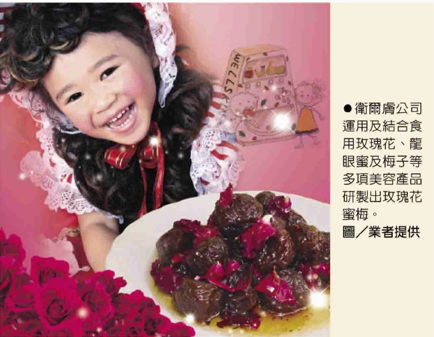 專業健康保健及美容產品研製的衛爾膚公司,新開發結合多項美容產品研製出玫瑰花蜜梅,該產品以山形食用玫瑰花辨、台灣省產龍眼蜜及信義風櫃斗青梅等黃金組合所製成,天然無人工色素、香精,提供國內消費者食療方面的好選擇。