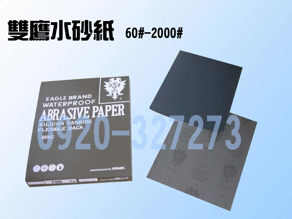 日本雙鷹牌水砂紙、KOVAX水砂紙規格23x28公分。番號:80#~2000#用於機床、汽車、船舶、木工、合板、家具、塑膠、壓克力、機械零件等的拋光磨料鋒口的銳利面,保持方向性,所以研磨時不但快速而且