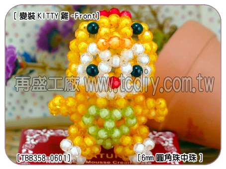 串珠材料包-變裝KITTY雞-圓角珠中珠(6mm)#TBB358-0601成品尺寸:約73mm(高)*62mm(寬)*37mm(前後)內附:珠珠、表格作法圖小朋友最喜歡的卡通人物,俏皮鮮活地造型讓所有