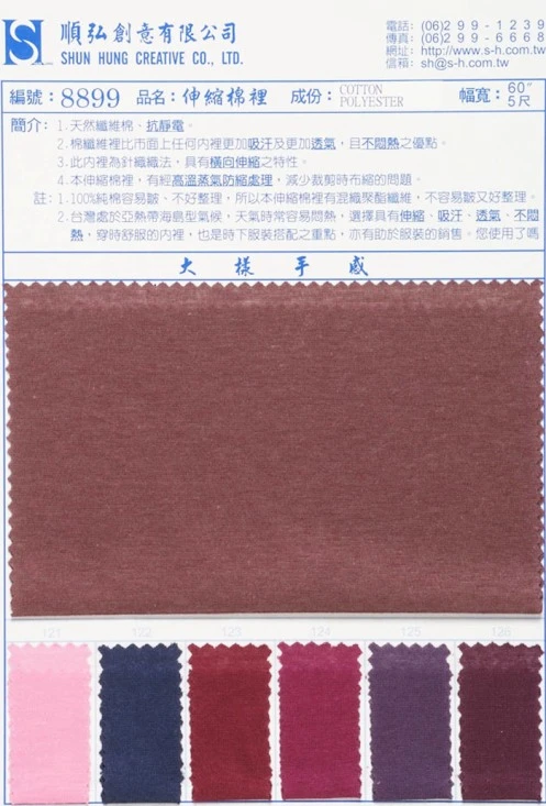 各種伸縮內裡:8899#伸縮棉裡、5858#厚絲襪布、6868#絲光內裡、5566#伸縮沙典