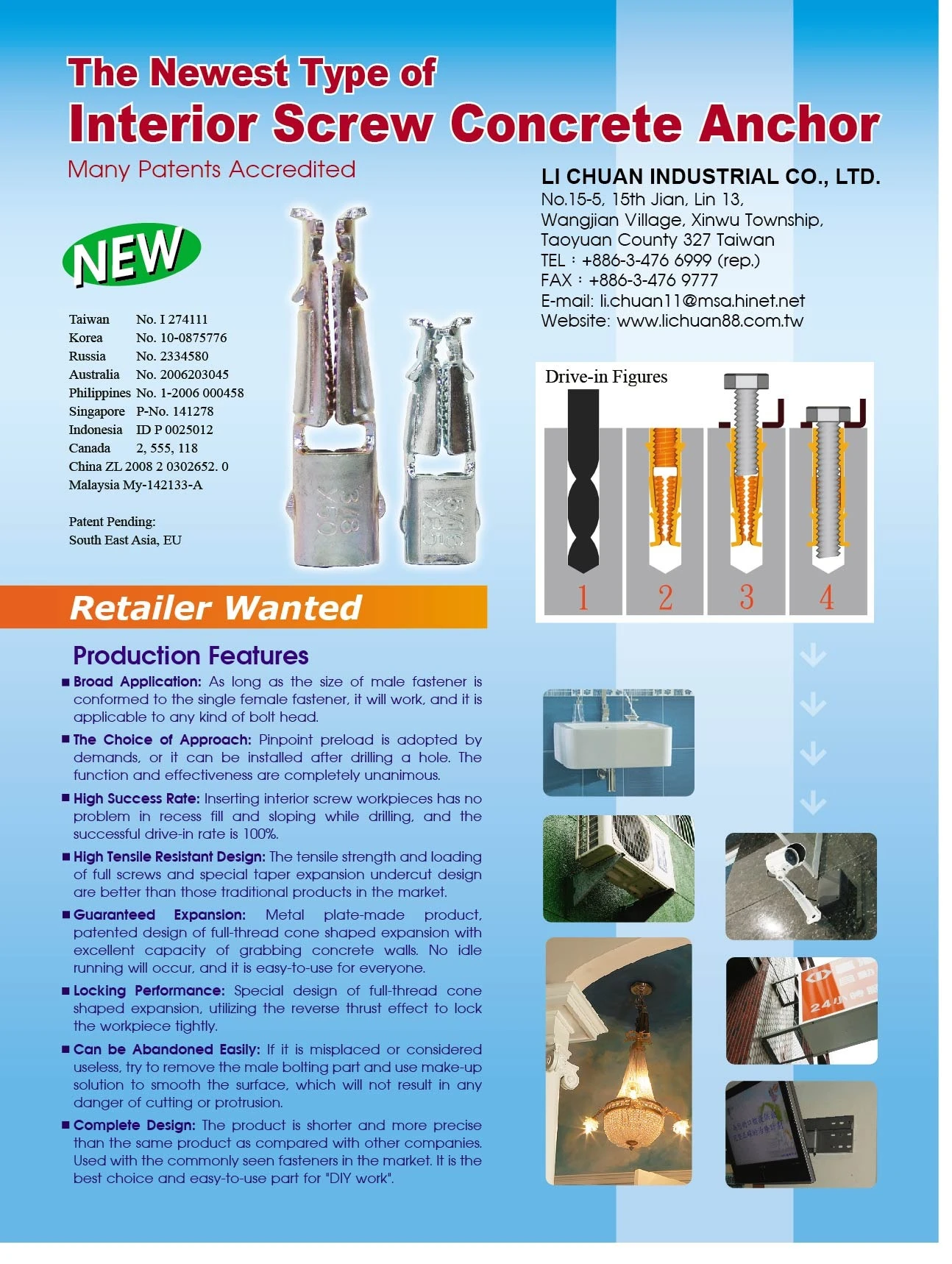 ㄇ本公司是新式內牙型金屬膨脹螺絲(附件內),並榮獲22國發明專利的製造廠商。產品適用於建築業,空調業,燈飾業,廣告看板業,電視壁掛,衛浴(廚具)水電業,監視器業等相關產業。若貴公司有產品的需求或加入經銷,歡迎與我們連絡,若需更多產品介紹也請跟我們聯繫,謝謝!