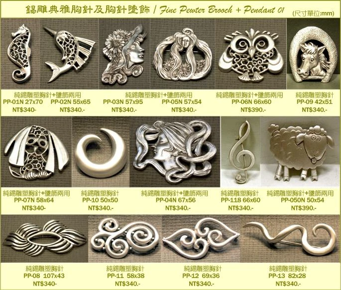 愛錫館Toptinco:典雅高尚的錫雕佩帶飾品~女仕優質胸針.ElegantDesignedFinePewterBrooch&Pendant,optionalforLadies.專業居家傢飾,