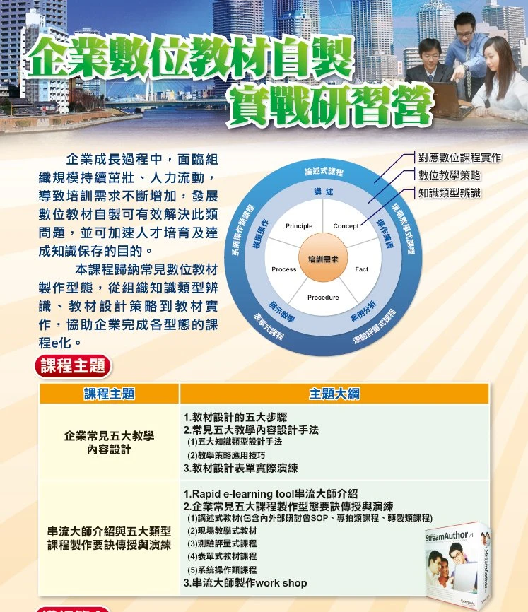 企業成長過程中,面臨組織規模持續茁壯、人力流動,導致培訓需求不斷增加,發展數位教材自製可有效解決此類問題,並可加速人才培育及達成知識保存的目的。本課程歸納常見數位教材製作型態,從組織知識類型辨識、教材設計策略到教材實作,協助企業完成各型態的課程e化。