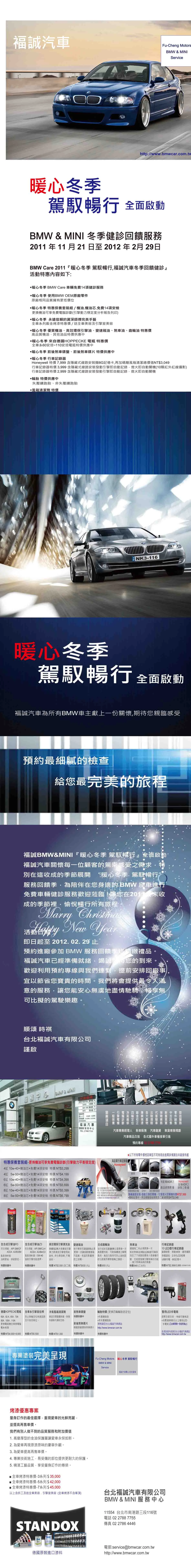 褔誠汽車BMW『暖心冬季駕馭暢行』全面啟動褔誠汽車關懷每一位顧客的駕乘感受之需求,為陪伴在您身邊的BMW座車進行免費車輛健診服務歡迎蒞臨!讓您在2011歲末收成的季節裡,愉悅暢行所有旅程。