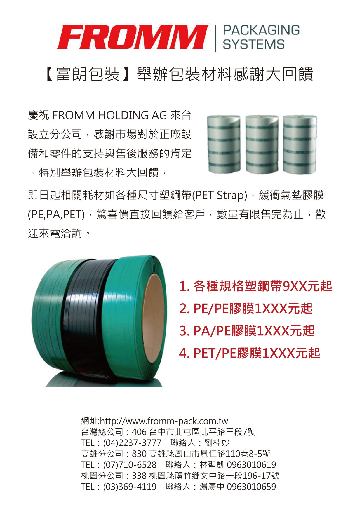 庆祝FROMMHOLDINGAG来台设立分公司,感谢市场对于正厂设备和零件的支持与售后服务的肯定,特别举办包装材料大回馈,即日起相关耗材如各种尺寸塑钢打包带(PETStrap),缓冲气垫用胶膜(PE,