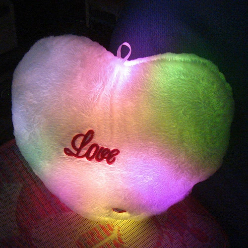 產品特色抱枕採用高檔超柔面料,內充高透明純正公仔棉,發光晶瑩剔透,擁抱舒適而溫馨,手感與透光效果更好,發光源為高亮度LED電子燈,屬於冷光源,無輻射,無發熱,安全環保,美觀時尚,只需3顆3號電池,就可