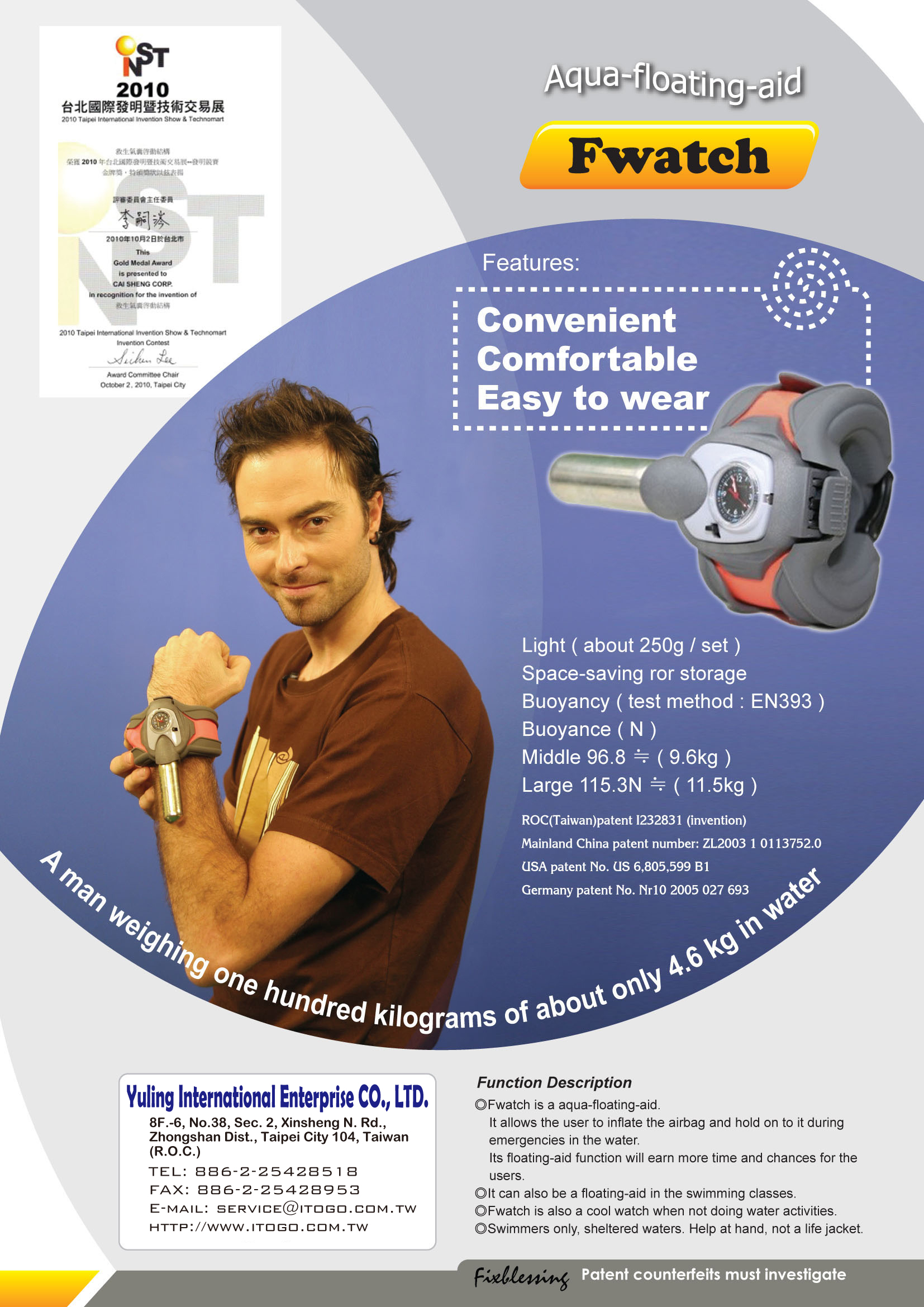 世上最輕巧的水上助浮器。擁有多國專利近日更榮獲法國金牌獎殊榮。戲水安全防護酷炫救生氣囊。沖浪客、水上活動必備單品。不用承受悶熱不便的救生衣。安全指示:1.可做教學及學習游泳的助浮器材。2.附防水錶蕊、