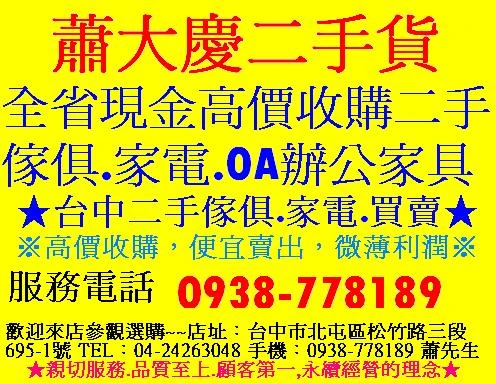全省收購二手,台中縣市收購二手, 買賣二手,回收二手,家具,家電,辦公家具0938-778189蕭先生 網友大力推薦大慶二手貨全省收購二手傢俱、回收、買賣、二手傢俱、二手家電、OA辦公家具0938-778189蕭先生 大慶二手精緻生活館 大慶二手貨~~收購2手、買賣2手、回收2手家具、家電【台中縣市】【專業評估】【親切服務】【二手傢俱】【二手家電】【辦公家具】【高價收購、現金處理】免費估價專線:0938-778189蕭先生若需估價可以寄照片至我ㄉ信箱powerman0817@yahoo.com.tw 這是我的部落格http://tw.myblog.yahoo.com/jw!DcdXSOiCHwBFpRSePwQyCc6D.xc-台中大慶二手貨【不只高價收購,我們賣的更便宜】歡迎來店參觀選購店址:台中市潭子區崇德路4段57號 TEL:04-25336608 手機:0938-778189 親切服務.品質至上.顧客第一,永續經營的理念