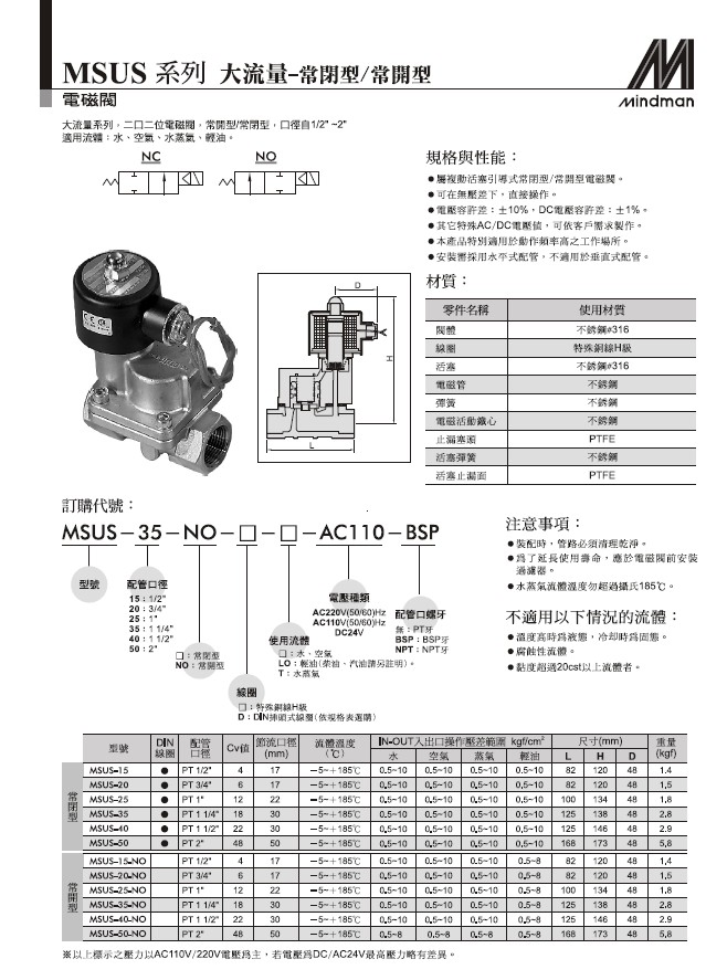 不鏽鋼二口二位電磁閥大流量型 介質:水,空氣,水蒸氣,瓦斯,真空,輕油MSUS-20-AC110V MINDMAN,日本PISCO、NISCON、NIHONSE