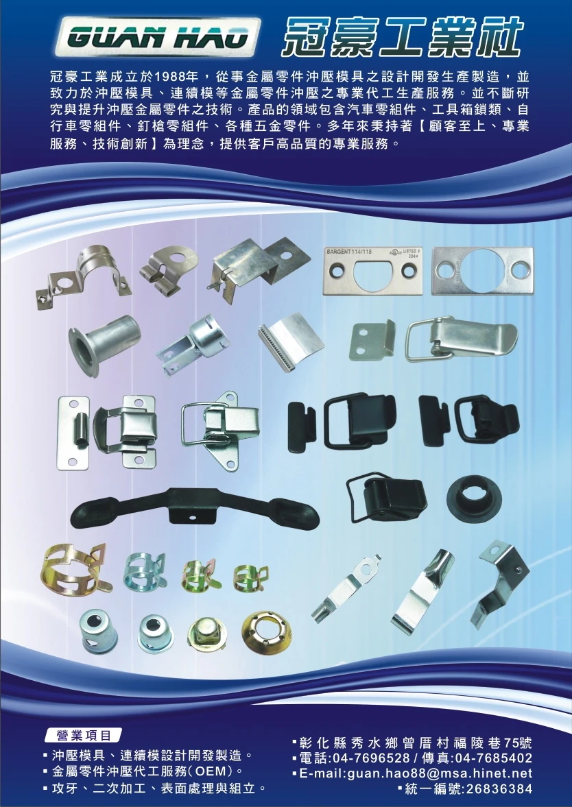 冠豪工業成立於1988年,從事金屬零件沖壓模具之設計開發生產製造,並致力於沖壓模具、連續模等金屬零件沖壓之專業代工生產服務。並不斷研究與提升沖壓金屬零件之技術。產品的領域包含汽車零組件、工具箱鎖類、自行車零組件、釘槍零組件、各種五金零件。沖壓設備由傳統沖床到直軸氣壓式沖床、自動攻牙機、卯釘卯合機。多年來秉持著【顧客至上、專業服務、技術創新】為理念 ,提供客戶高品質的專業服務。本公司提供大量生產加工、客製化試產等服務,歡迎來電洽詢!!