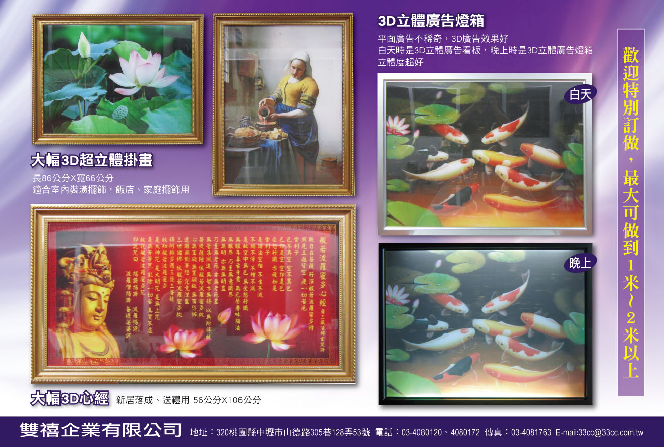 多年來不段投入研發3d光柵立體圖製造,從靜態3d到動態3d最近都已完成’並獲得日內瓦發明展銀牌獎,並且圖片大.小,數量多與少都能生產.