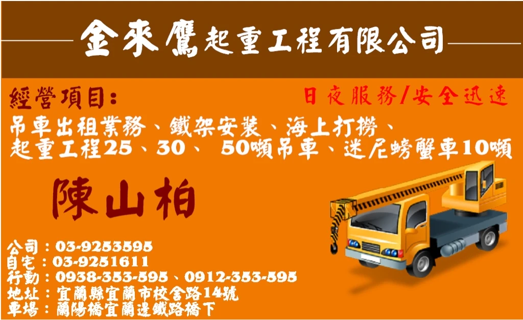 經營產品:海上打撈、鐵架安裝、高樓鋼筋及機械吊運安裝、大型機件安裝、高樓鋼筋及機械吊運安裝、超高燃燒塔吊裝、超重機件起重工程、或精密儀器吊裝、重機械遷移安裝, 鋼筋、帽樑、吊紐澤西、鷹架、家具、招牌、霓虹燈…等各種難度吊運 ,專業經驗豐富,服務項目廣泛,信用可靠,歡迎各大公司及機關團體長期合作