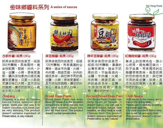 炸醬、麻辣炸醬、麻辣醬、麻辣鍋底、義大利青醬、紅醬、香椿素肉醬、黑胡椒素肉醬、番茄素肉醬、辣味素肉醬、香椿菇菇醬、海苔醬、沙拉醬: