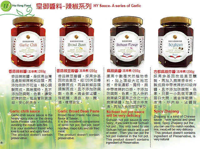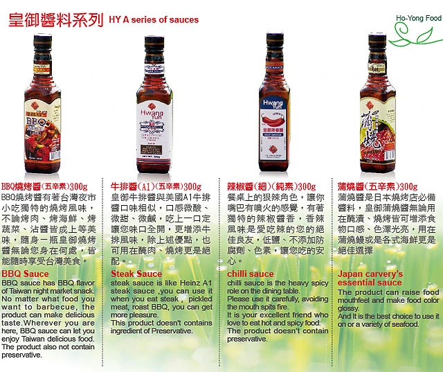 辣椒醬、辣豆瓣醬、甜辣醬、燒雞醬、香蒜辣豆瓣醬、香蒜辣椒醬、醬油、豆瓣醬、沙茶醬、黑胡椒醬、燒烤醬、蒲燒醬、五味醬、醬油膏、辣醬油、牛排醬、米醋、黑醋