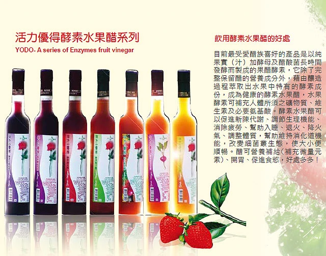 蘋果醋、甜菜根醋、紅葡萄醋、蔓越莓醋、梅子醋、青木瓜鳳梨醋