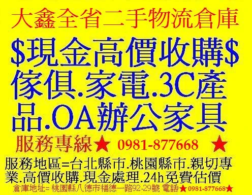 桃園收購二手傢俱, 買賣,回收2手傢俱北部,二手家電,辦公傢俱♥0981-877668♥ ◆公司名稱:大鑫全省二手物流中心 ◆服務項目:台北,桃園,新竹,全省,收購,回收,買賣,二手傢俱,二手家電,辦公傢俱 ◆服務時間:am9:00~pm10:00 ◆服務區域:大台北地區,新北市,桃園縣市,新竹縣市 ◆費用說明:親切服務,免費估價 ◆聯絡人:林先生 ◆聯絡方式:0981-877668 若需估價可以寄照片至我ㄉ信箱:pp217167@yahoo.com.tw ◆公司地址: 舊倉庫地址= 桃園縣龜山鄉振興路795巷1弄13號電話0981-877668 新倉庫地址= 桃園縣八德市福德一路92之29號 電話0981-877668 部落格http://tw.myblog.yahoo.com/jw!Go407rmCAEV90SCp0quwvg--