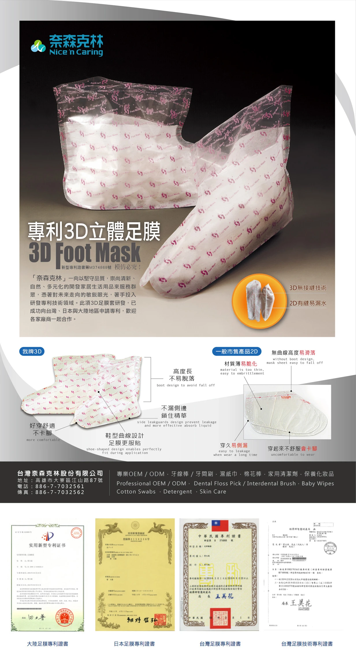 足膜此商品已經在日本和韓國造人轟動,並銷售成績已達三千萬只,我公司目前是台灣最早申請到台灣和大陸3D足膜技術專利的公司,目前上架的足膜商品是侵權的,我公司已發信提醒希望他們作出合理解釋,當然也希望有機會和其他廠商洽談發展的機會,我想此商品未來是很有商機的,愛美不只需要面膜,腳的去角質保養也是重要的,如有興趣合作,請來信深談。tks~希望合作愉快!