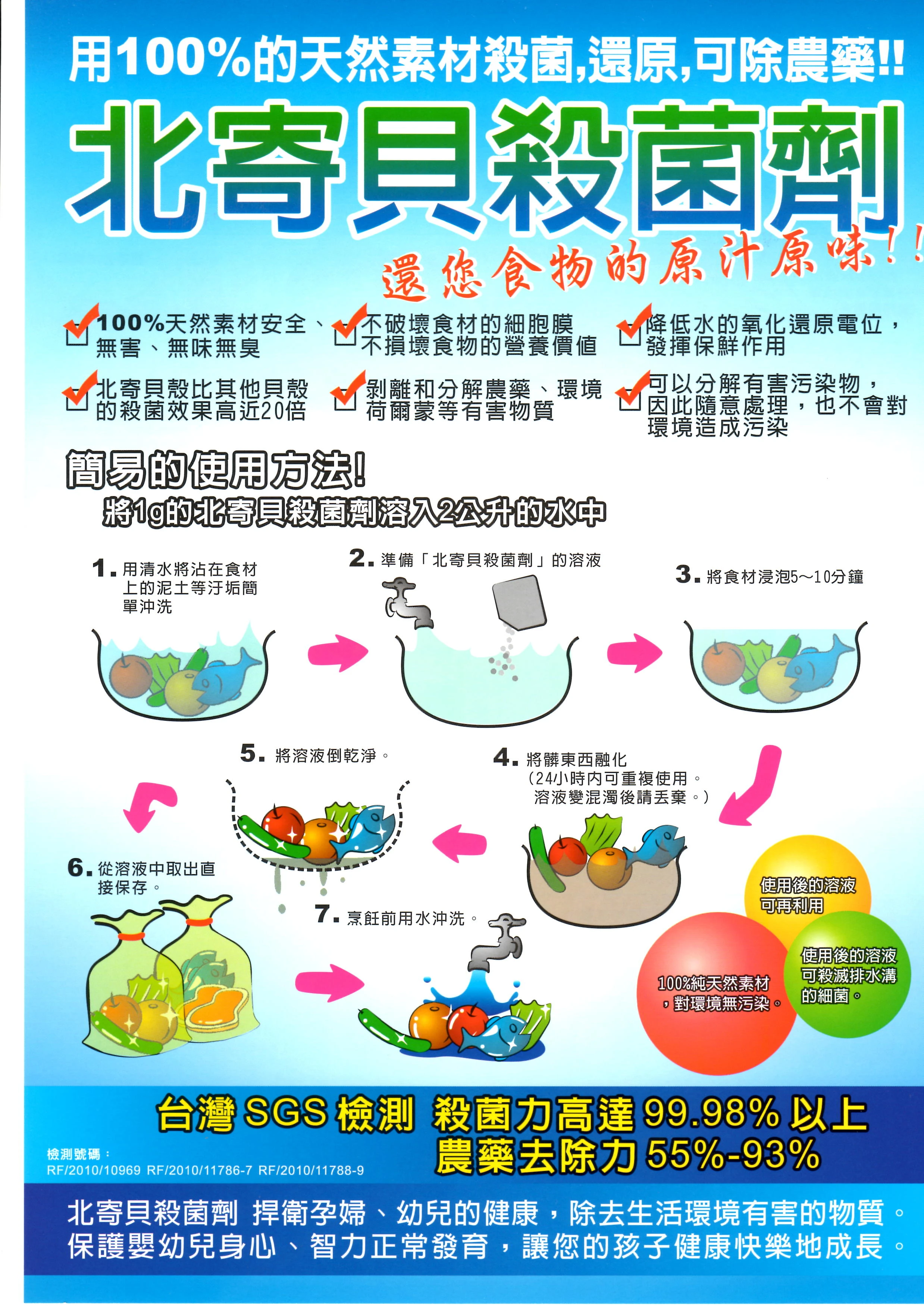 北寄貝貝殼粉除菌劑在日本已有多年使用經驗,在台灣已有SGS安全認證,北寄貝貝殼粉可用於清洗蔬果消除農藥,生鮮產品可去除腥味,居家可當清潔消毒劑使用,此產品為純天然不加任何化學藥劑。