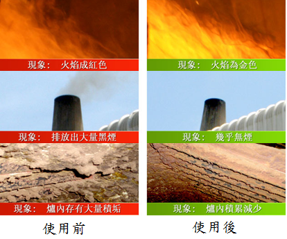 提高燃燒效率,鍋爐不會結煤焦。 降低排放廢氣Nox,SOx,Cox,PM。 適用