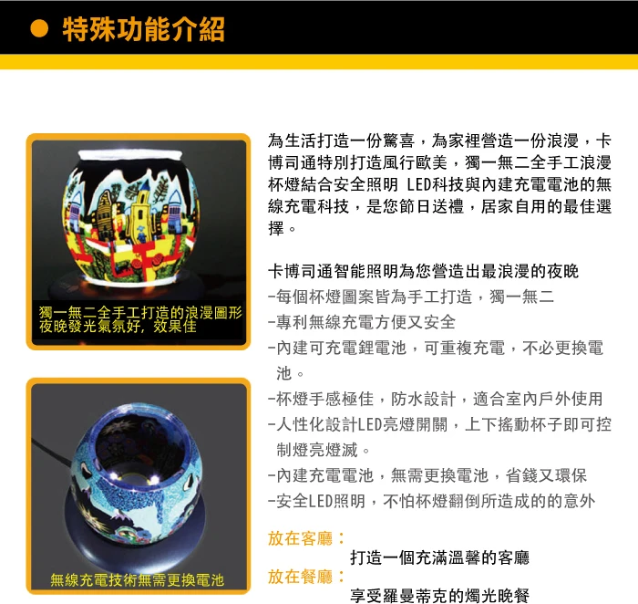 全手工打造,獨一無二浪漫杯燈加上專利無線充電與