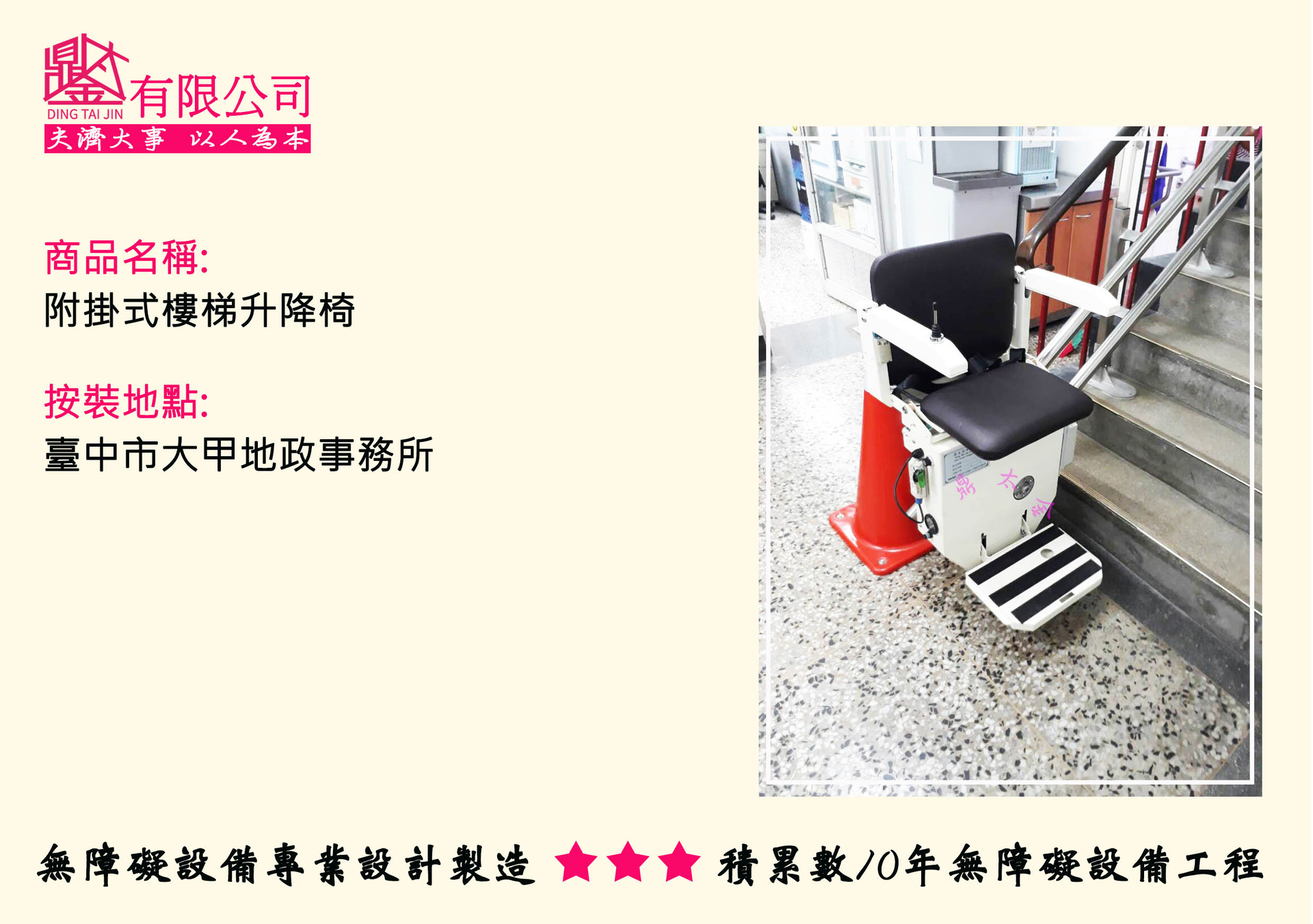 鼎太金樓梯升降平台,依客戶需求量身打造,並提供專業的服務,使