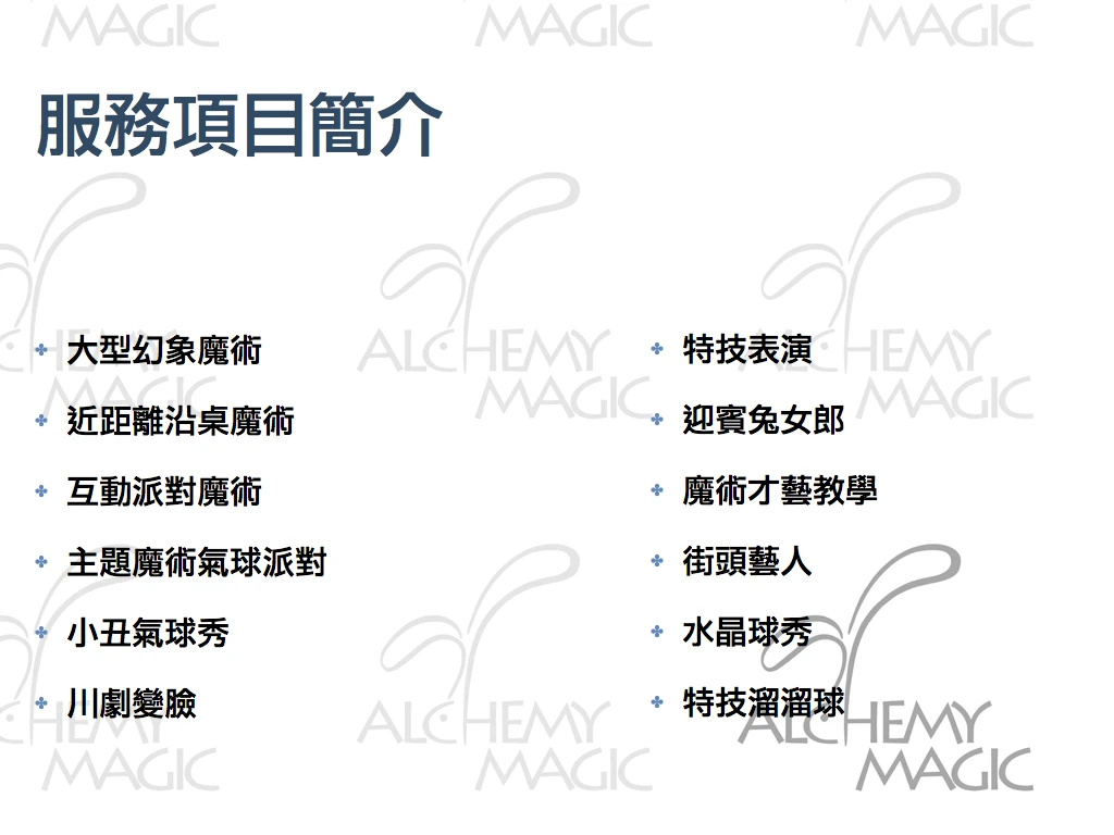 | 大型魔術表演、魔幻飛鴿秀、魔術教學、造型氣球教學、近距離魔術秀、舞台互動秀、主持人、四川川劇變臉、迎賓女郎、迎賓氣球師、人入氣球、小丑魔術師、 |