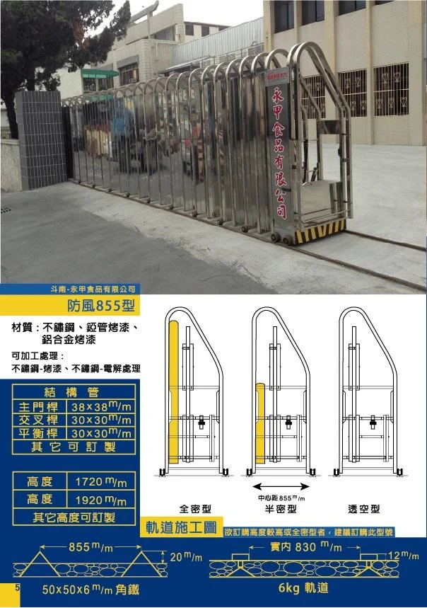 角鐵軌距中心855㎜,鐵軌6㎏實內830㎜,為斜背樣式,高度為圍牆與大柱二者中間較佳,建議高度為1720㎜(含)以上,若受風面較大,可選擇855防風型較佳;依客戶需求製作。